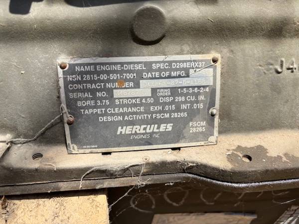 Hercules D298ER Diesel Engine s/n 3467878 built in December 1988. This engine appears to be unused. Starter and Alternator are missing