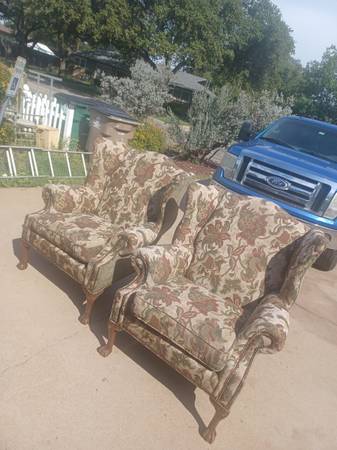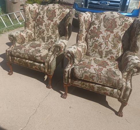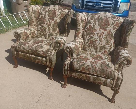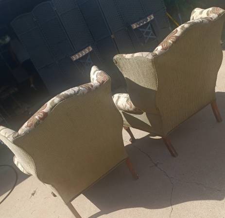 Reduced- we dont have room for these chairs. Very well made nice looking wingback chairs. Golden beige and olive sage green. Floral front solid back. Sturdy with some wear in a few places. We just...