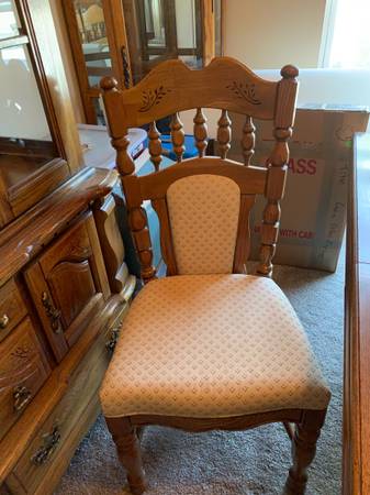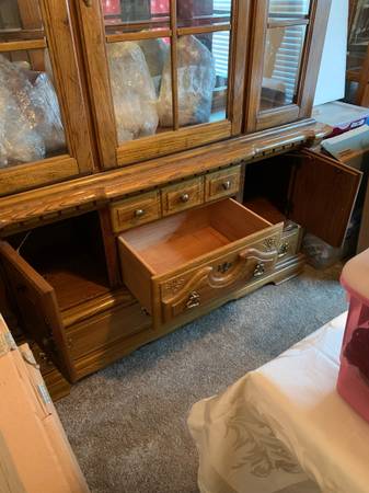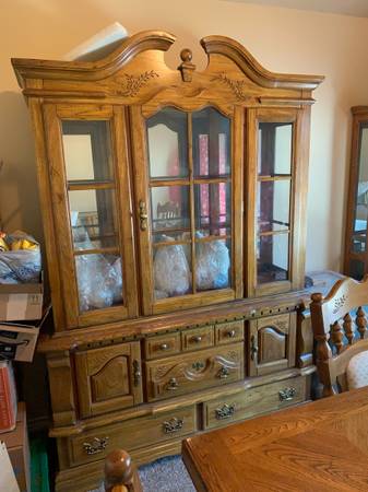 Dining room set Solid Oak lighted hutch both sides 3 large drawers one silverware drawer and two cabinets. Used pristine condition