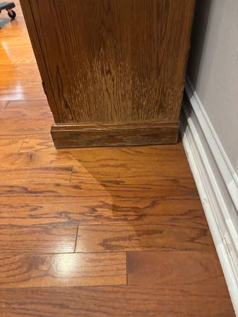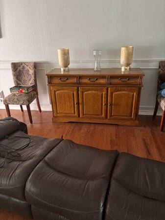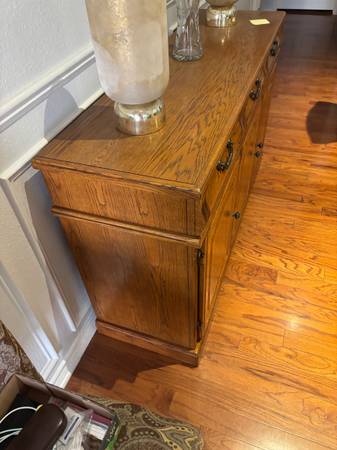 58” long 34” tall 17 1/2” wide Some damage on the right bottom (right as your looking at it) Needs some light sanding and refinishing