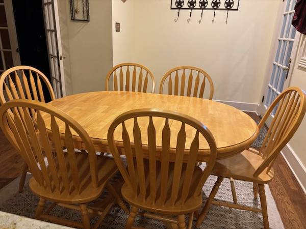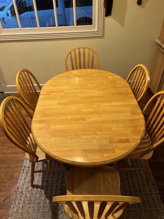 This is a well-made kitchen table and six chairs. We still like it but my wife wanted to change the style of our kitchen. It has a removable leaf to scale it down in size if desired. Solid wood--this table will outlast most sets. Scratches on some chairs from the kids. The chairs have a swivel feature that makes them easier to get in and out. The chairs are comfortable. Text me to take a look.