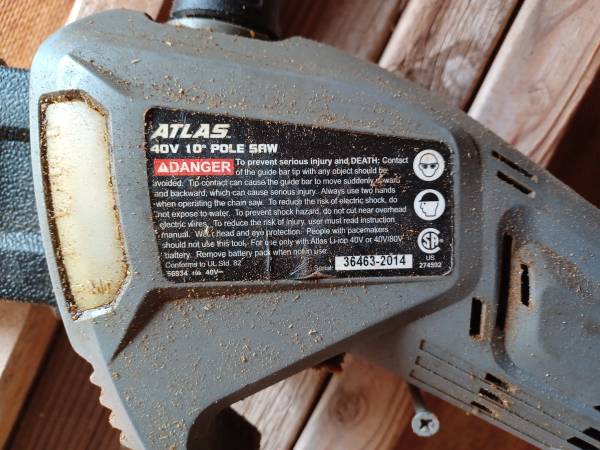 Atlas Cordless 40 Volt 9' long pole saw. Includes 2 - 40 Volt Batteries & Charger. Shown without the extension which is also pictured. Some other tools were / are available using the Atlas 40...