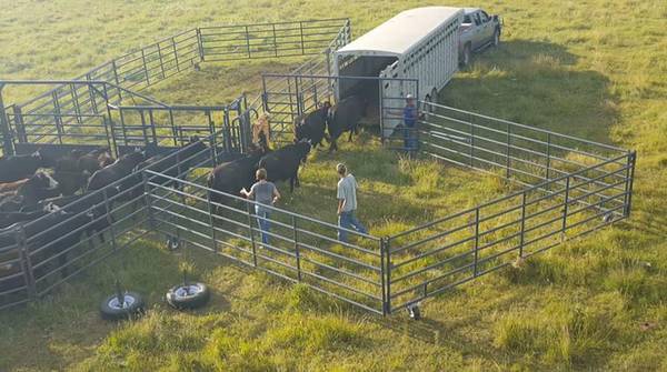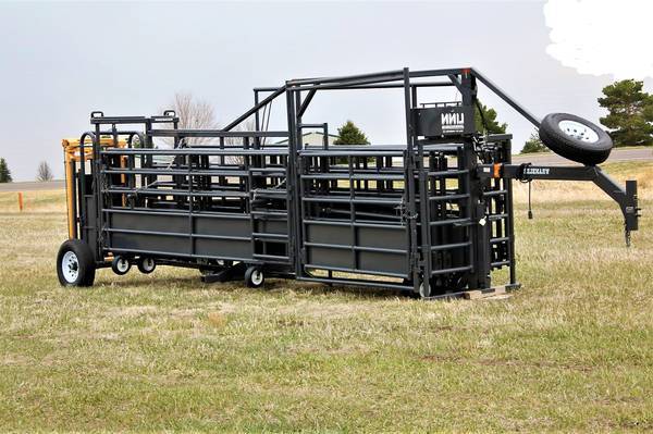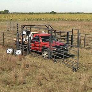 One person can set up the Wrangler Portable Corral in about ten minutes ready to contain 150-400 head of cattle without lifting a panel. The self contained system easily pulls down the highway at the speed limit and fits thru any gate your pickup will. Works on extremely uneven terrain. Over 20 different corral configurations are possible. Wheels on each panel and a electric over hydraulic jack eliminate lifting and saves time. Includes frame gates for sorting. And now comes standard with a solar power charging unit so you battery is being charged whether it's at the farm or in the field. Patent Pending