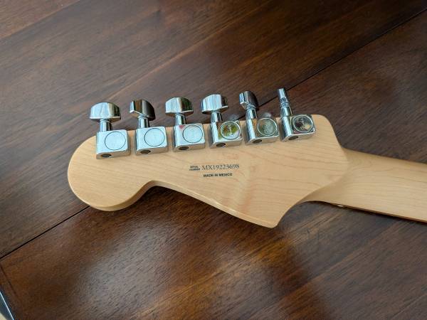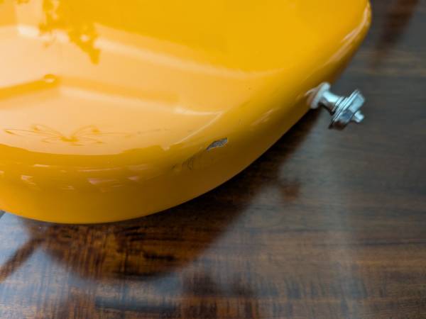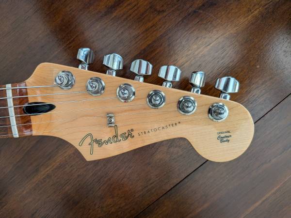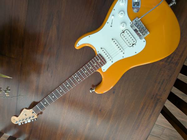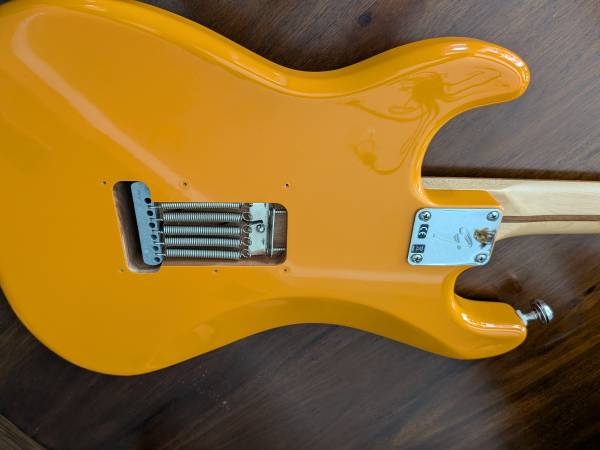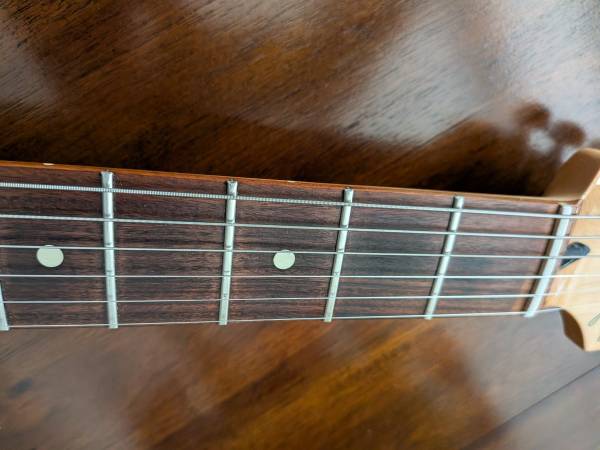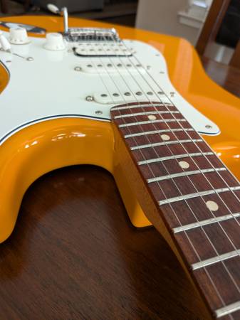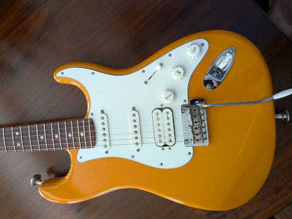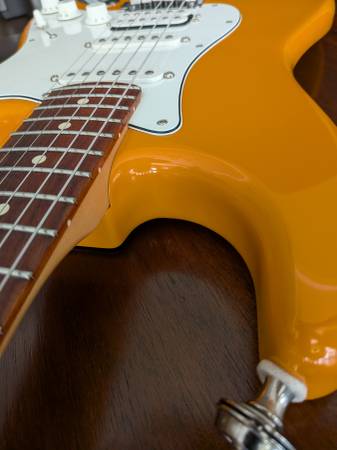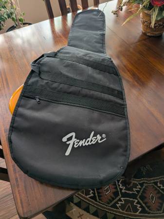 Nice guitar in a wonderful color. Includes a fender gig bag. Has a ding on the bottom edge of the guitar as shown in the pics. Firm.
