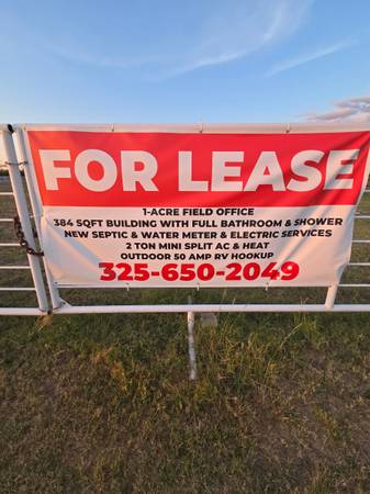 This field office sits on 1 acre of fenced land, and is a turn-key operation! It's ready for your next commercial or industrial office space. Short term and long term lease options available. For more information please contact 325 six five zero twenty forty-nine. Thank you for your interest!